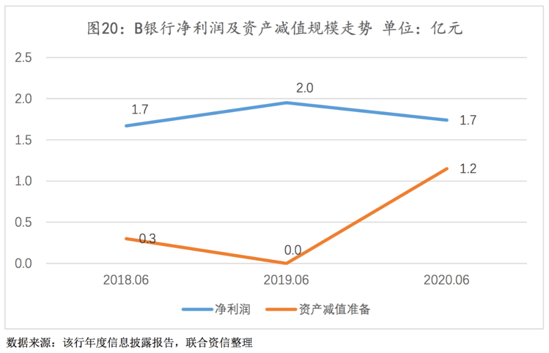 2020年受新冠肺炎疫情影响,信贷资产质量下行明显,贷款拨备已显不足;贷款定价优势有所弱化,净利润增长明显承压。2020年以来,在新冠肺炎疫情的影响下,B银行6月末的不良贷款率上升至将近3%,同时其明显加大了贷款减值计提力度(见图20),但由于利润规模有限对拨备计提产生一定约束,其拨备覆盖率降至117%,已低于监管对于该目标的最低要求。若B银行添加贷款减值预备计提力度直至拨备覆盖率达标,则势必会对其净利润的完成产生明显负面影响。假设在其他条件不变的状况下,若2020年6月末B银行拨备覆盖率达到150%,则上半年所完成的净利润约为0.4亿元,较上年同期下降约80%。此外,在政策导向以及同业竞争不断加剧的影响下,B银行贷款定价优势有所弱化,净息差程度已与商业银行均匀净息差程度较为接近,且受限于当地经济增长乏力、农商行无法跨区域展业等要素,2020年上半年B银行贷款规模增速明显放缓,净利润增长明显承压。