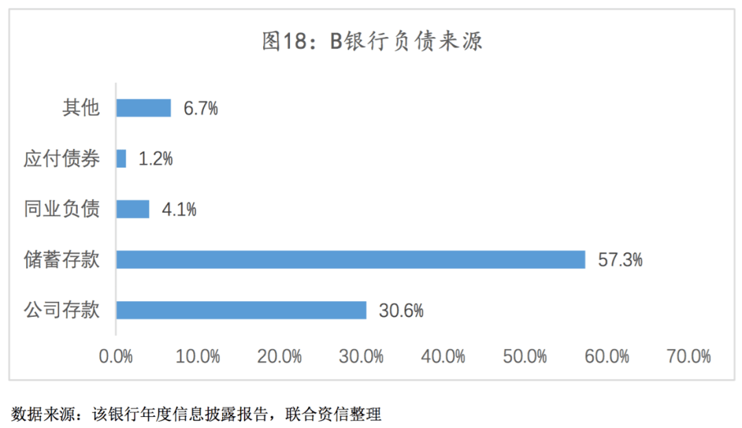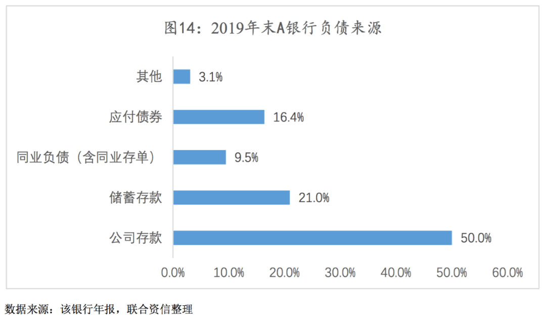 负债端资金成本压力较大,负债结构有待进一步优化。城商行竞争过程中普遍面临在乡镇营业网点数量远低于农商行、在城区客户信任度不如国有大行和股份制银行的成绩,致使其成本较低的储蓄存款来源不足,多数城商行经过吸收波动性欠佳以及成本绝对较高的公司存款以满足资产配置需求。近年来,为降低负债端资金成本压力,A银行持续加大揽储力度,不断压降公司存款占负债总额的比重,但公司存款占比仍处于较高程度(见图14),其中公司定期存款占负债总额的比重为29.7%,负债端资金成本压力较大。