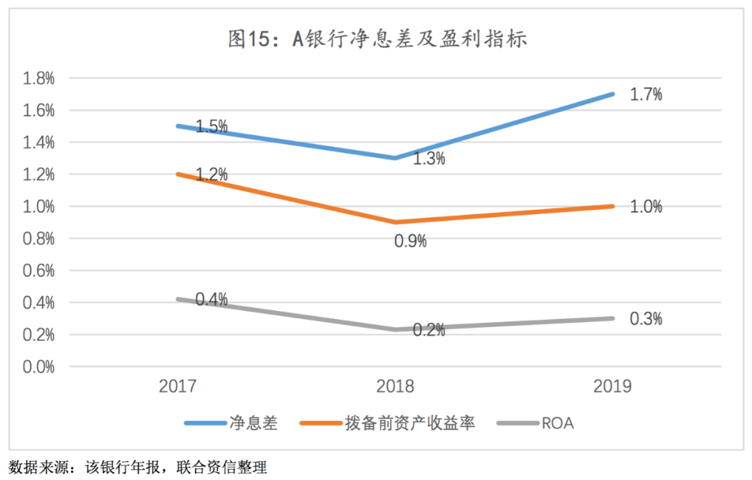 净息差低于同业均匀程度,盈利才能较弱。A银即将资产端资金重点配置于定价程度呈下行趋向的信贷类资产,同时添加投资收益率偏低的标准化债券配置力度,这样便减弱了资产端生息才能,加之负债端资金成本压力依然较大,A银行净息差程度远低于商业银行和城商行均匀程度(见图15)。此外,由于贷款及投资资产质量面临较大下行压力,A银行加大了资产减值预备计提力度,致使盈利目标全体呈下降趋向。