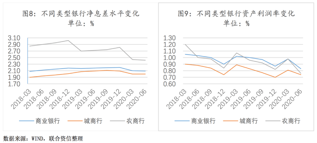 在资产端生息才能下降与负债端资金成本添加的双重影响下,中小银行净息差与资产利润率全体均呈现下降态势。净息差是衡量商业银行生息资产获取利息支出才能程度的重要目标,与利息支出、利息支出以及生息资产规模息息相关;资产利润率是反应商业银行全体盈利才能的目标,计算要素包含净利润与均匀资产规!T谥行∫兄,农商行普遍拥有较好的储蓄存款基。断⒏赫杀揪越系,净息差不断以来明显高于商业银行均匀程度(见图8);城商行对于资金成本绝对较高的对公存款依赖程度较高,净息差程度与资产利润率持续低于商业银行均匀程度。近年来,在资产端方面,贷款定价程度在政策引导等要素的影响下呈下行趋向;债券与非标资产收益率全体呈下降态势,致使投资资产收益率亦有所下降。在负债端方面,存款定期化与结构性存款规模提升致使存款付息率明显提升。在以上两方面的综合影响下,中小银行净息差程度全体呈下降态势。此外,资产质量下行导致中小银行明显加大了拨备计提力度,净利润规模呈下降态势,从而导致资产利润率全体下降(见图9)。
