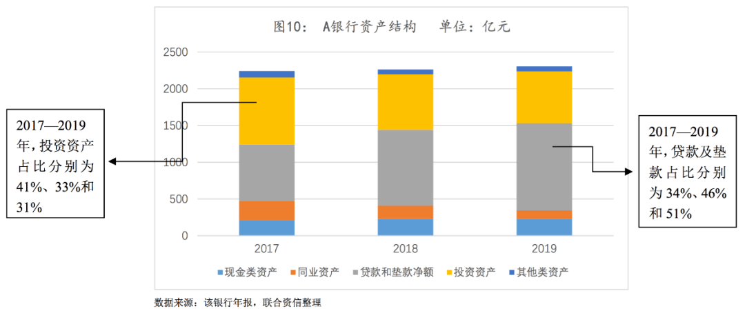 我们选取的A银行具有对公存款占存款总额比重高、非标投资规模较大面临压降压力以及信誉风险加速暴露等城商行运营特点,上述要素均对其盈利程度构成较大负面影响。A银行资产规模处于2000至3000亿元区间,从资产结构来看,近年来,随着资管新规以及金融去杠杆政策的不断推进,A银行在“回归本源”的监管导向下,投资资产规模不断紧缩,贷款和垫款占资产总额的比重明显上升(见图10)。