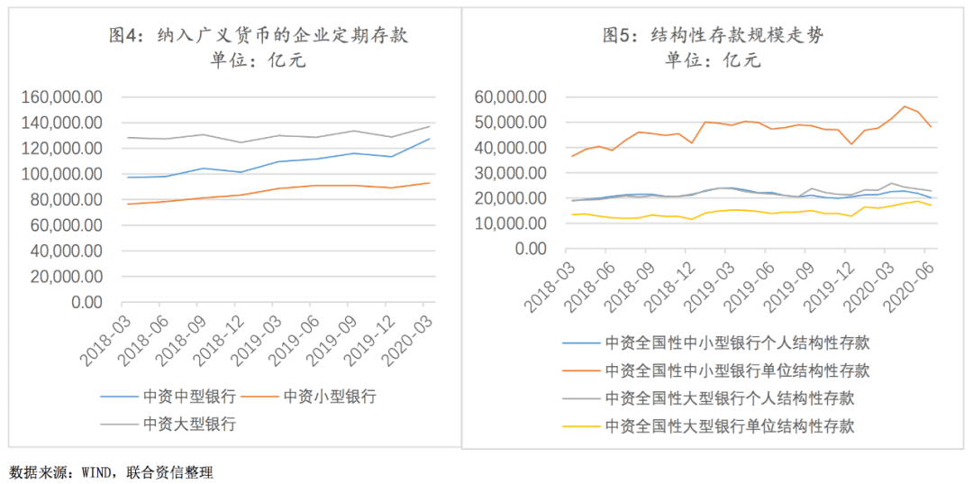 存款定期化与结构性存款规模增长致使存款付息率明显提升,从而推升了银行资金端的成本程度。近年来,为呼应国家普惠金融的号召,以国有行及股份行为主的大型银即将金融服务不断下沉,区域性中小银行在当地的竞争环境日趋激烈。为保持存款业务在当地的竞争力,中小银即将定期存款利率上浮至同业较高程度,并依托在当地营业网点广泛、运营历史较长等优势进行展业,带动了定期存款规模全体呈增长趋向(见图4)。此外,为加强存款业务吸引力,以中小银行为主的部分商业银行开展与利率、汇率、指数等波动挂钩的结构性存款业务,该业务需客户承担一定风险,故付息率普通高于同期限的银行存款。2020年前4个月,结构性存款规模增长2.5万亿元,余额打破了12万亿元,刷新了历史新高,其中中小银行添加1.5万亿元(见图5),结构性存款业务的开展一定程度上加大了中小银行存款业务的竞争力,但较高成本结构性存款规模的增长也使得存款付息率明显提升。