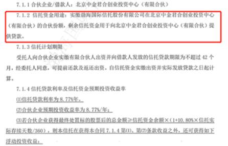 从知情人提供的信托合同来看,由渤海信托设立的这个信托计划运用资金的方式为, 2999.7万元用于认缴中金君合有限合伙人出资,剩余部分资金以贷款的方式发放给中金君合,以谋求完成信托预期收益。