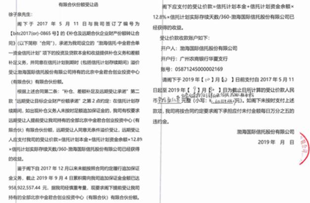 另外,据了解,徐子泉在信托存续时期并未履行相应的补仓、差额补足义务,累计拖欠9.59亿元保证金。2019年9月18日,信托计划委托人新时代证券(实践为广州农商行)经过渤海信托发函徐子泉,要求其履行回购中金君合有限合伙份额的承诺,并领取16.11亿元回购款。