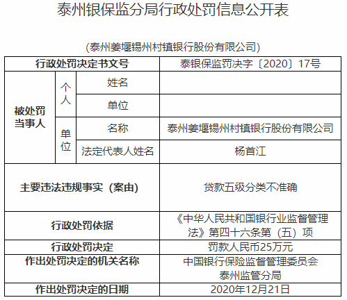 同业违规 挪用信贷资金 江苏姜堰农商银行受罚120万元