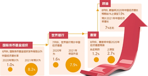惠誉将中国全年GDP增长预期由原来的1.2%上调至2.7%;世界银行在7月底发布的《中国经济简报》中预测,中国的经济增速会放缓至1.6%,但相比于世界其他大国的“负增长”,这个成绩曾经非常亮眼;IMF估计,2020年中国经济增长率为1.0%,是全球次要经济体中独一可以完成正增长的国家。