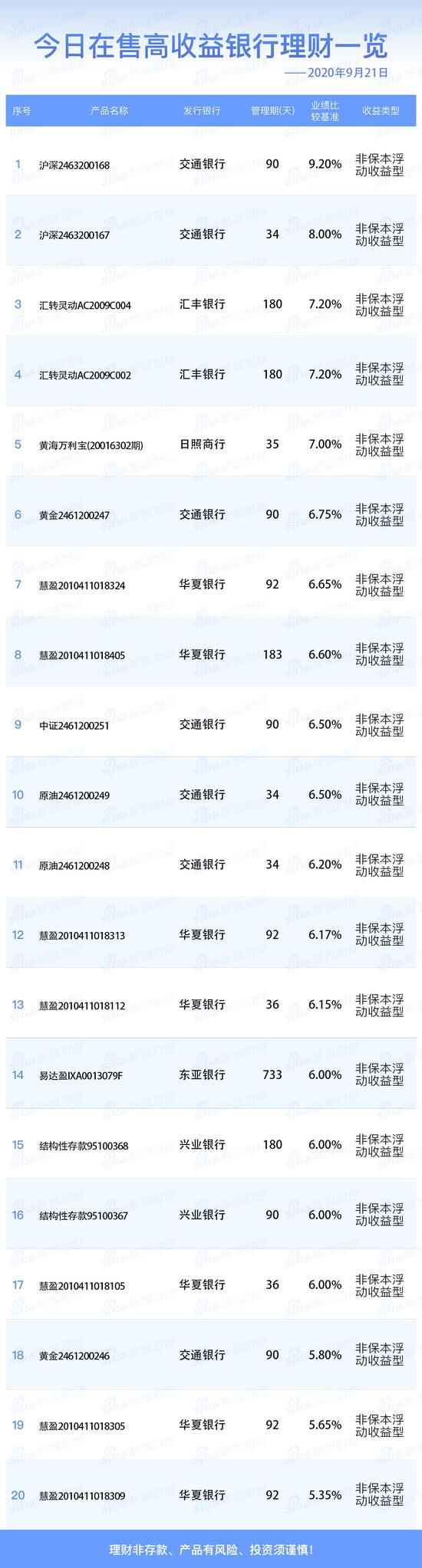 银行21日在售高收益理财产品一览