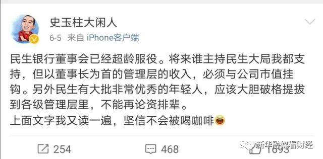 值得留意的是,相比此前董事会换届时的“内斗”,此次民生银行老股东们对高迎欣的接纳程度较好。6月5日,东方350vip葡亰集团350vip葡亰集团350vip葡亰集团集团、泛海350vip葡亰集团350vip葡亰集团350vip葡亰集团集团和新希望联名向股东大会提议,选举高迎欣为第七届董事会执行董事。当天,该行非执行董事、巨人网络实控人史玉柱发布微博表示,“将来谁掌管民生大局我都支持,但以董事长为首的管理层的支出,必须与公司市值挂钩。”并称民生有大批非常优秀的年轻人,应该大胆破格选拔到各级管理层里,不能再论资排辈。