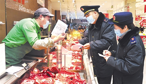 2020年12月30日,河北省河间市市场监督管理局工作人员在一家超市检查肉类食品安全。 新华社记者 朱旭东摄