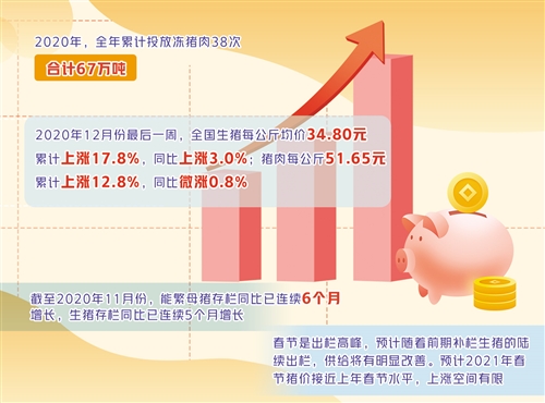 对1月8日生猪期货正式挂牌买卖当前全国猪价的走势,朱增勇以为可从供需两方面进行分析。从消费看,春节是传统消费淡季,但2020年12月份以来猪价下跌抑制了部分消费需求。从供给看,截至2020年11月份,能繁母猪存栏同比已连续6个月增长,生猪存栏同比已连续5个月增长。春节是出栏高峰,估计随着后期补栏生猪的陆续出栏,供给将有明显改善。综合判别,估计2021年春节猪价接近上年春节程度,下跌空间有限。