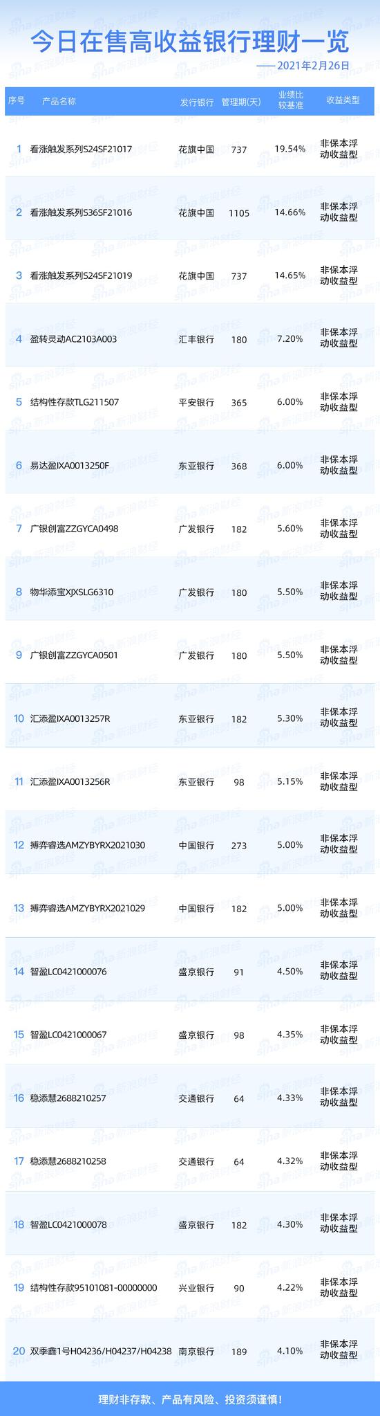 2月26日在售高收益银行理财产品:今日业绩比较基准在6%以上的银行人民币理财产品共6款。花旗中国“看涨触发系列S24SF21017”业绩比较基准最高,为19.54%。