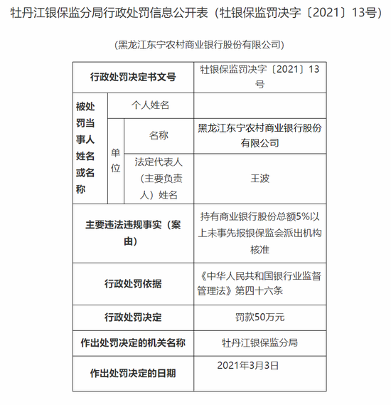 黑龙江东宁农商行被罚50万:持有银行股份总额5%以上未事前上报