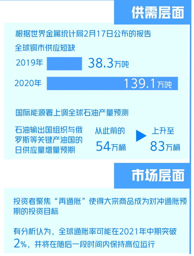以动力大宗商品为例。从供给层面看,将来几个月,非欧佩克产油国的产量仍存变数,尤其是美国、加拿大等国家的油企如何应对近期油价下跌值得关注。从需求层面看,国际动力论坛秘书长约瑟夫·麦克莫尼格尔曾表示:“疫情对动力需求的影响在动力市场历史上是空前的。”国际动力论坛2月18日发布的报告则以为,虽然2021年石油需求将反弹,但是反弹力度低于去年疫情导致的下滑力度。因此,需求反弹是推升短期原油价格的重要要素,但能否支撑长期增长仍待观察。