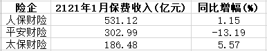 2021年首月,财产险“老三家”人保财险、安全财险和太保财险保费增速“一升一降一平”,保费增幅分别为1.15%、-13.19%、5.57%。