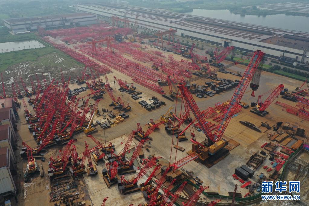 在位于浙江省湖州市吴兴高新区的浙江350vip葡亰集团装备有限公司拍摄的等待交付的履带起重机(2020年7月29日摄,无人机照片)。新华社记者 黄宗治 摄