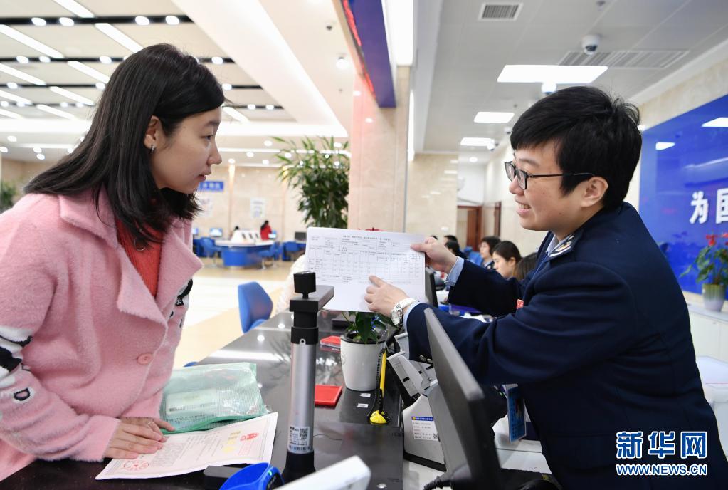 工作人员在国家税务总局福州市鼓楼区税务局办税服务大厅为企业财务人员引见减税申报表的填写方法(2020年1月21日摄)。新华社记者 魏培全 摄