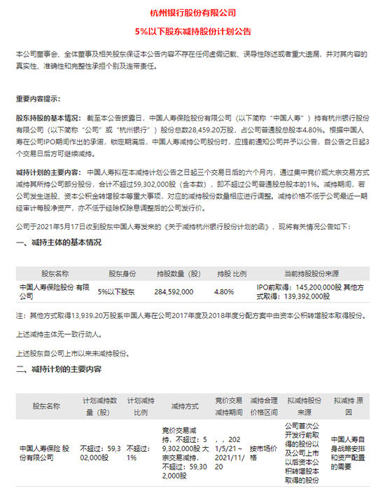 杭州银行遭中国人寿清仓离场后会否形成股价波动?
