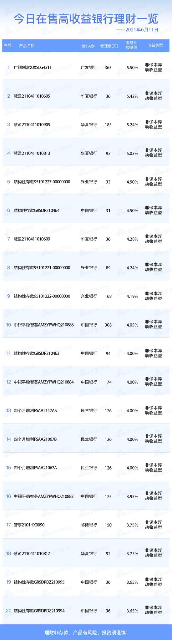 新浪财经6月11日在售高收益银行理财产品:今日业绩比较基准在5.0%以上的银行人民币理财产品共4款。广发银行的“广银创富XJXSLG4311”业绩比较基准最高,为5.50%。