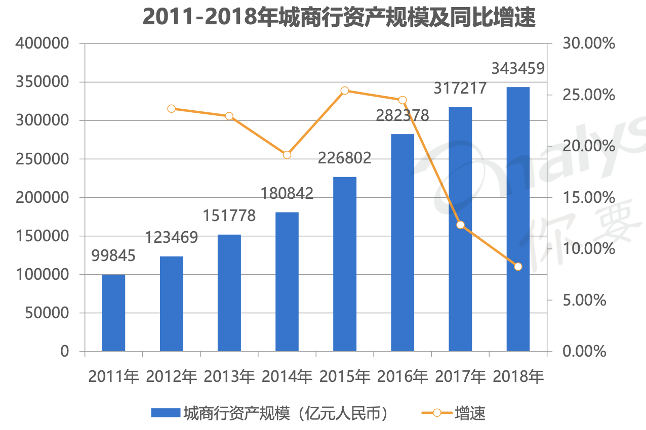 数据显示,2018年全国共有134家城商行。截至2018年,全国城市商业银行资产总额达343459亿元,占国内银行业资产总额的 13.13%。2011-2018年资产年均增速将近20%,增速一直领先于同业。