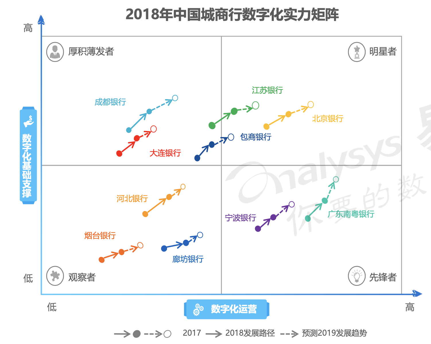 据行业白皮书显示,城商行数字化实力矩阵是从城商行的数字化运营才能及数字化基础支撑体系两个维度综合反应城商行数字化程度和竞争地位的分析模型。横轴——数字化运营才能包括数字化获客渠道、数字化产品创新、数字化风控、精准营销等目标。纵轴——数字化基础支撑包括双速IT零碎、敏捷组 织和文明、金融科技浸透、生态圈建设等机制。得出数字化明星者——350vip葡亰集团银行、江苏银行、包商银行,先锋者——广东南粤银行、宁波银行 厚积薄发者——成都银行、大连银行,观察者——烟台银行、河北银行、廊坊银行。