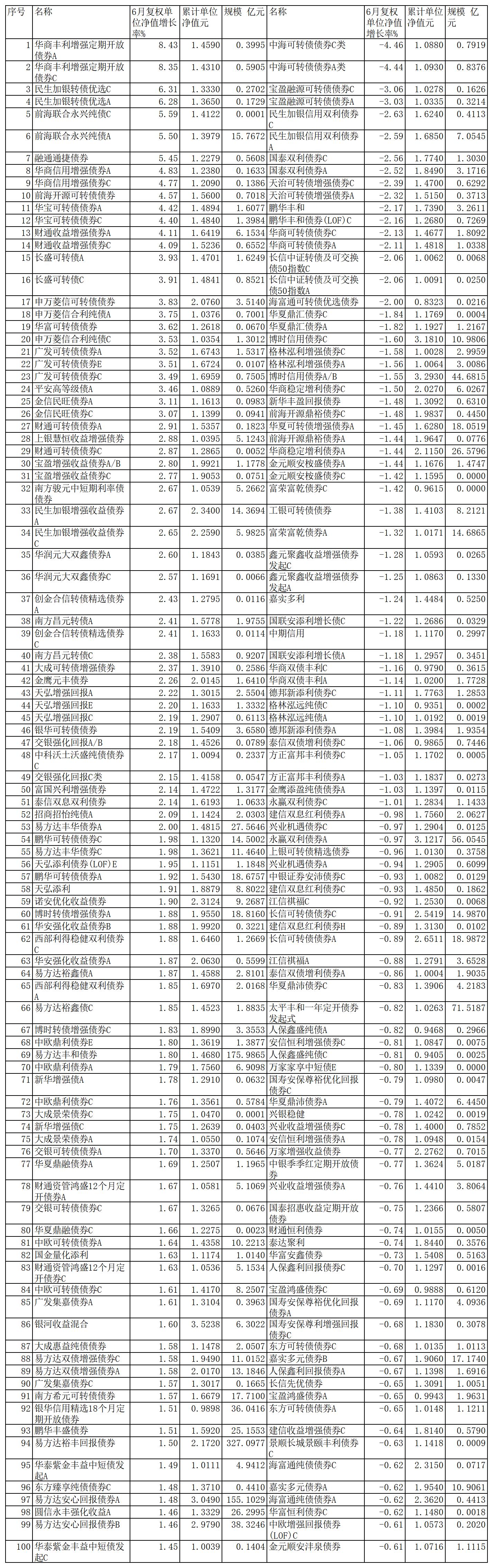 6月份债券型基金涨跌幅前100名