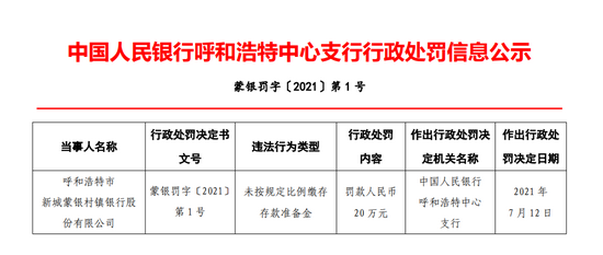 新城蒙银村镇银行违法被罚