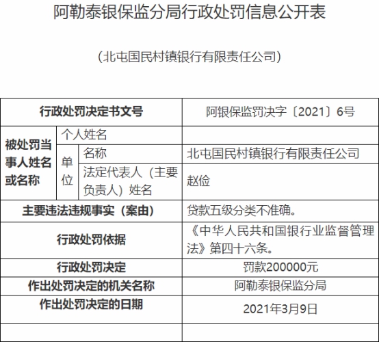 北屯国民村镇银行违法遭央行处罚