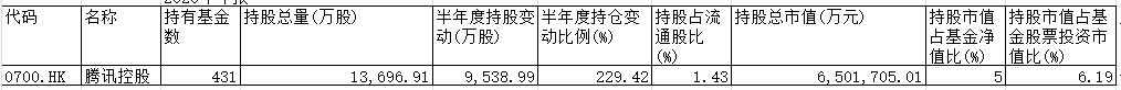 与2020年上半年末相比,2020年末基金对腾讯控股的持股数量添加9538.99万股,增幅229.42%。