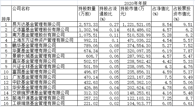 截至2020年末,腾讯控股持股市值超10亿的基金公司一览