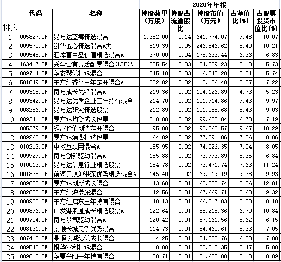 具体到基金产品,截至2020年末,持有腾讯控股市值超过5亿元的基金共有25只,持股市值超过10亿元的基金共有9只。