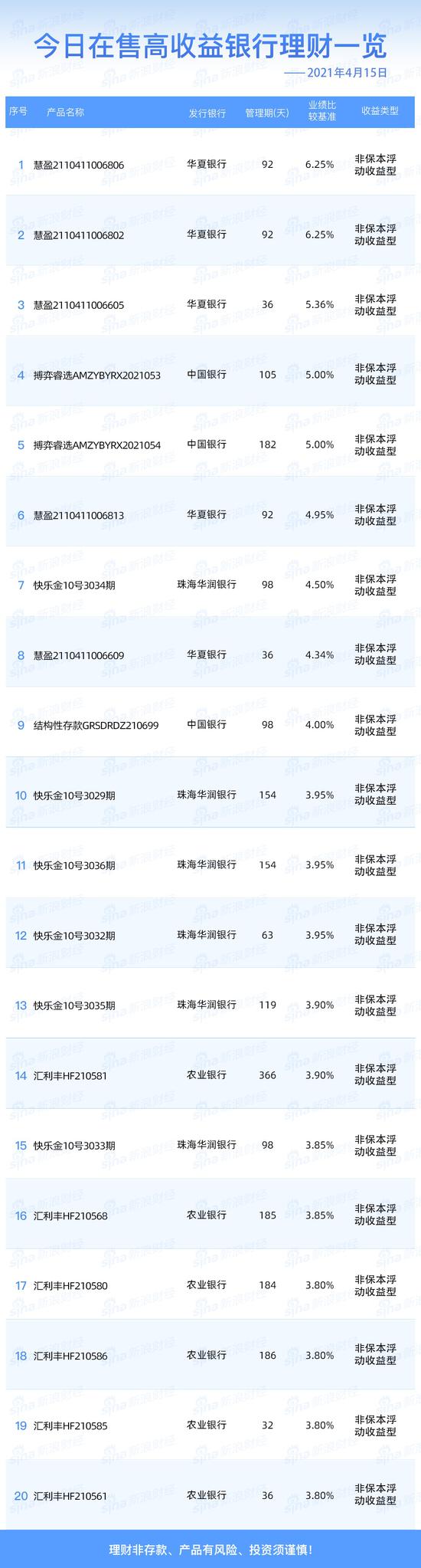 新浪财经4月15日在售高收益银行理财产品:今日业绩比较基准在5%以上的银行人民币理财产品共5款。华夏银行的“慧盈2110411006806”业绩比较基准最高,为6.25%。