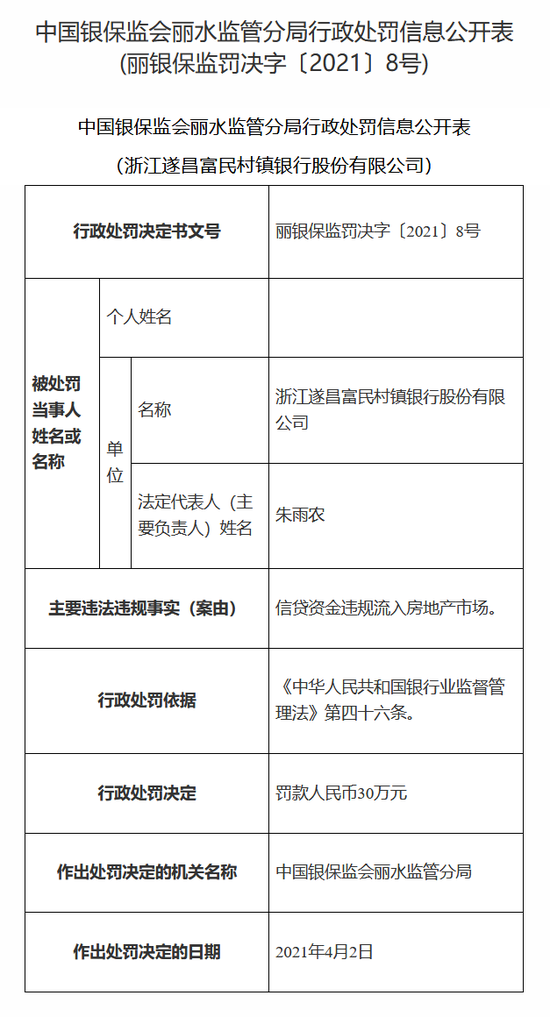 浙江杭州余杭农商行违法被罚 信贷资金被挪用于购房