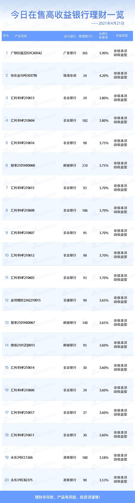 银行21日在售高收益理财产品一览