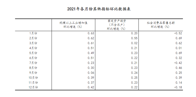 。2)根据季节调整模型自动修正结果,对近一年来各期国内消费总值、规模以上工业添加值、固定资产投资(不含农户)、社会消费品零售总额环比增速进行修订。修订结果及2021年四季度GDP环比数据、2021年12月份其他目标环比数据如下: