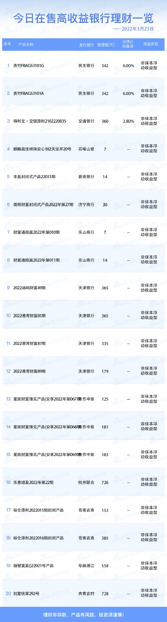 新浪财经3月23日在售高收益银行理财产品一览。今日业绩比较基准在2.80%及以上的银行人民币理财产品共3款。理财非存款、产品有风险、投资须谨慎!