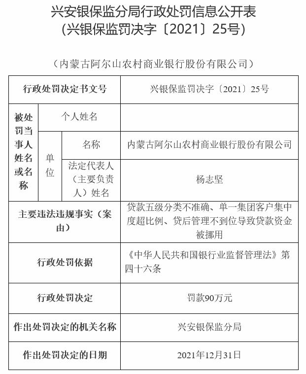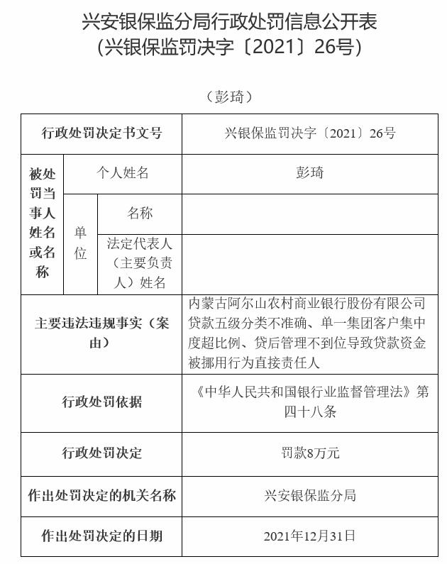 内蒙古阿尔山农商行相关责任人被罚6万元