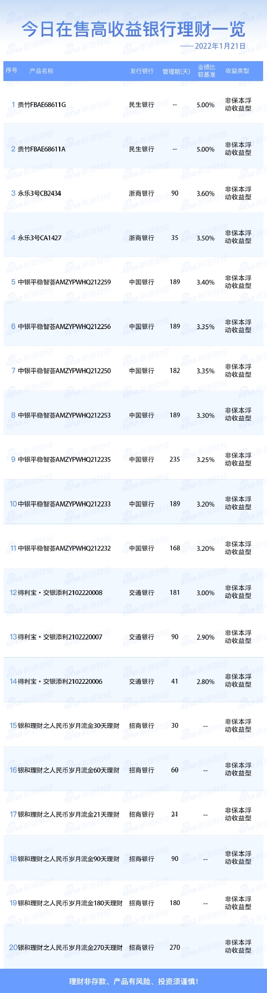 银行21日在售高收益理财产品一览