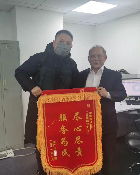 建行贵阳城北支行尽心为八旬老人找到20多年前的凭证,为表示感激客户的儿子特别送上锦旗