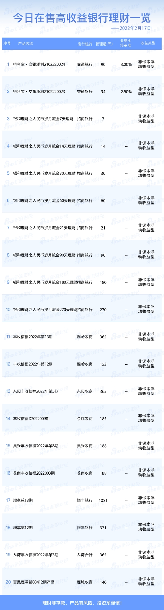 新浪财经2月17日在售高收益银行理财产品一览:今日业绩比较基准在2.90%及以上的银行人民币理财产品共2款。理财非存款、产品有风险、投资须谨慎!