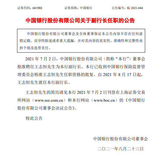 光大银行:王志恒执行董事、行长任职资历获核准