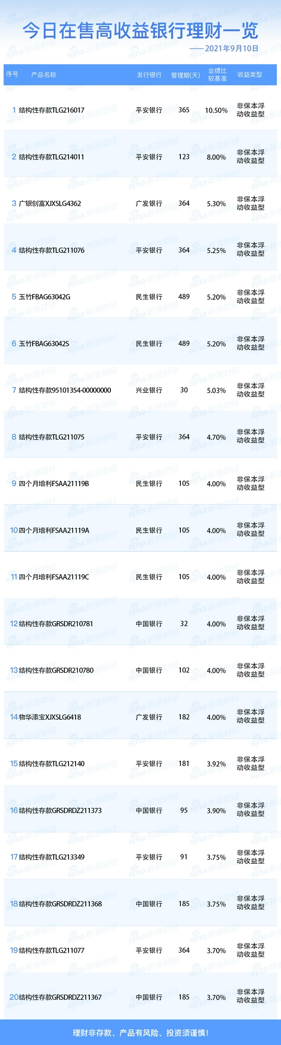 新浪财经9月10日在售高收益银行理财产品:今日业绩比较基准在5%以上的银行人民币理财产品共5款。安全银行的“结构性存款TLG216017”业绩比较基准最高,为10.5%。