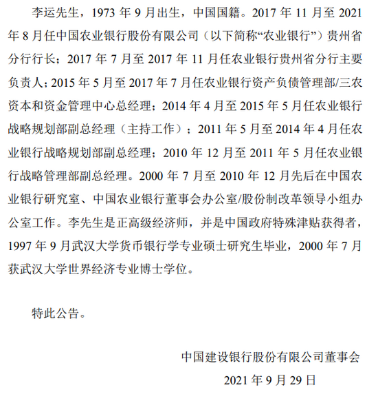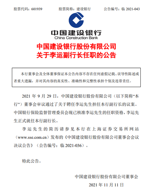 建设银行:张毅正式就任首席财务官