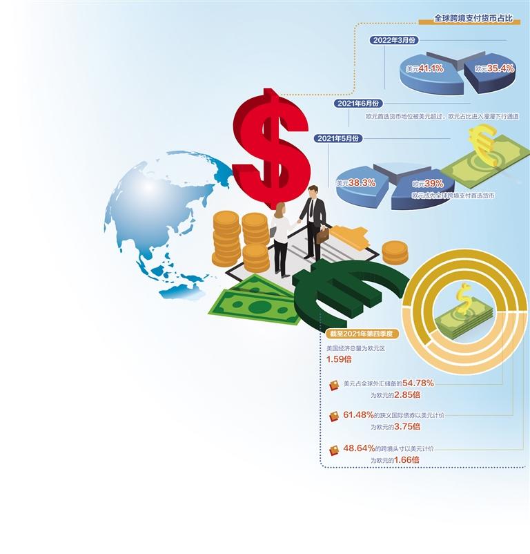 2021年5月份,根据环球银行金融350vip葡亰集团协会(SWIFT)数据,在基于金额统计的全球领取货币当月排名中,欧元占比39%,超越美元的38.3%,成为全球跨境领取首选货币。但是,好景不长,仅仅一个月后,欧元首选货币地位就又被美元超过,并从此进入漫漫下行通道。至2022年3月份,欧元在全球跨境领取中的占比已降至35.4%,而美元占比升至41.1%,欧元对美元汇率也持续走低,从2021年5月份的1.21跌至2022年5月11日的1.05。欧元过去一年的疲软走势不断引发外界对欧元以及欧元区经济前景的担忧。
