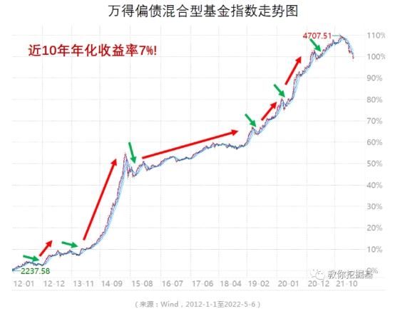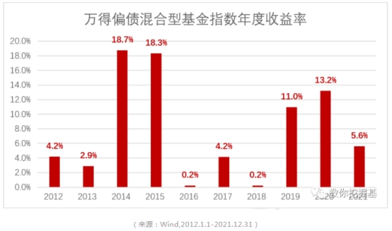 以权益仓位绝对更高的万得偏债混合型基金指数为例,指数在过去的10年间从来没有出现过年度级别的亏损。
