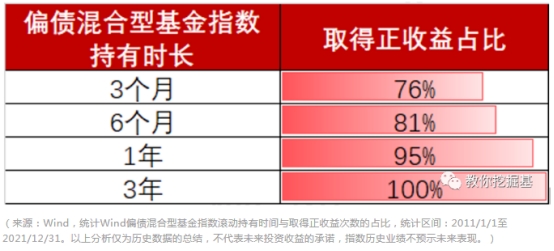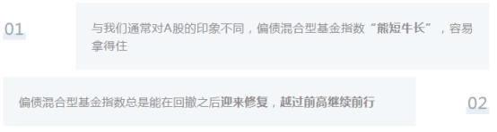 对2011年以来的数据进行回测可知,滚动持有Wind偏债混合型基金指数3个月、6个月、1年获得正收益占比分别为76%、81%、95%,持有工夫越长,获得正收益的比例越高。假如把持有工夫拉长至3年,获得正收益的比例可达100%!