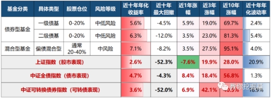 从近10年的年化收益率来看,偏债混合型基金(7.1%)>二级债基(6.3%)>一级债基(5.6%),都跑赢了代表股市表现的上证指数和代表债市表现的中证全债指数。