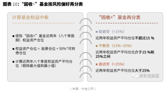 中金公司根据基金历史权益类仓位的中枢,对市面上五花八门的“固收+”基金进行了二次分类,划分为稳健、均衡、激进三档风险偏好。(注:此处仅为示例,具体以基金风险评价结果为准)
