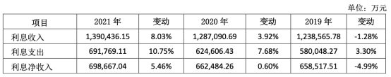 2021年,顺德农商银行完成利息净支出69.87亿元,同比增长5.46%。其中,利息支出139.04亿元,同比添加10.33亿元,增长8.03%;利息支出69.18亿元,同比添加6.72亿元,增幅10.75%。