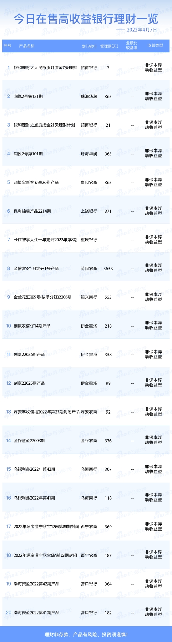 新浪财经4月7日在售高收益银行理财产品一览。理财非存款、产品有风险、投资须谨慎!