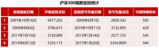 数据显示,从A股历史阶段高点开始定投,需求忍受的亏损最短为429天,最长达到592天(自然日),而且点位没有回到起始点位就曾经开始盈利了,假如低位加码定投,将大幅降低亏损工夫。